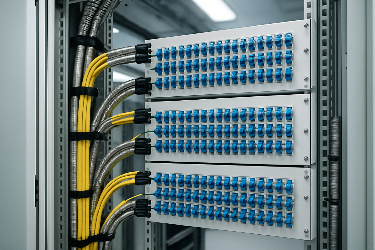 Die Verkabelung innerhalb der Leitstelle erfolgt über OM4-Multimode-Fasern für Distanzen bis 550 Meter oder OS2-Singlemode-Fasern für größere Entfernungen. Als Steckverbinder haben sich LC-Duplex für hohe Packungsdichte und E2000-LSH für besonders kritische Verbindungen etabliert.